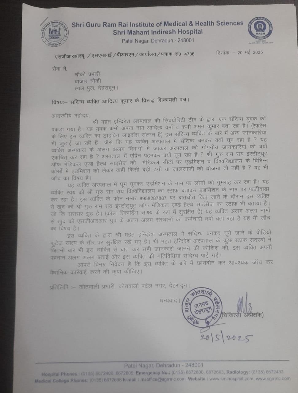 देहरादून। श्री महंत इन्दिरेश अस्पताल की सुरक्षा टीम ने एक संदिग्ध युवक को धर दबोचा है, जो कई दिनों से अस्पताल परिसर में संदिग्ध रूप से घूम रहा था। पूछताछ के दौरान युवक ने अपनी पहचान बार-बार बदली — कभी खुद को आदित्य कुमार, तो कभी अमन कुमार बताया, जबकि उसके ड्राइविंग लाइसेंस पर आदित्य वर्मा नाम दर्ज है।