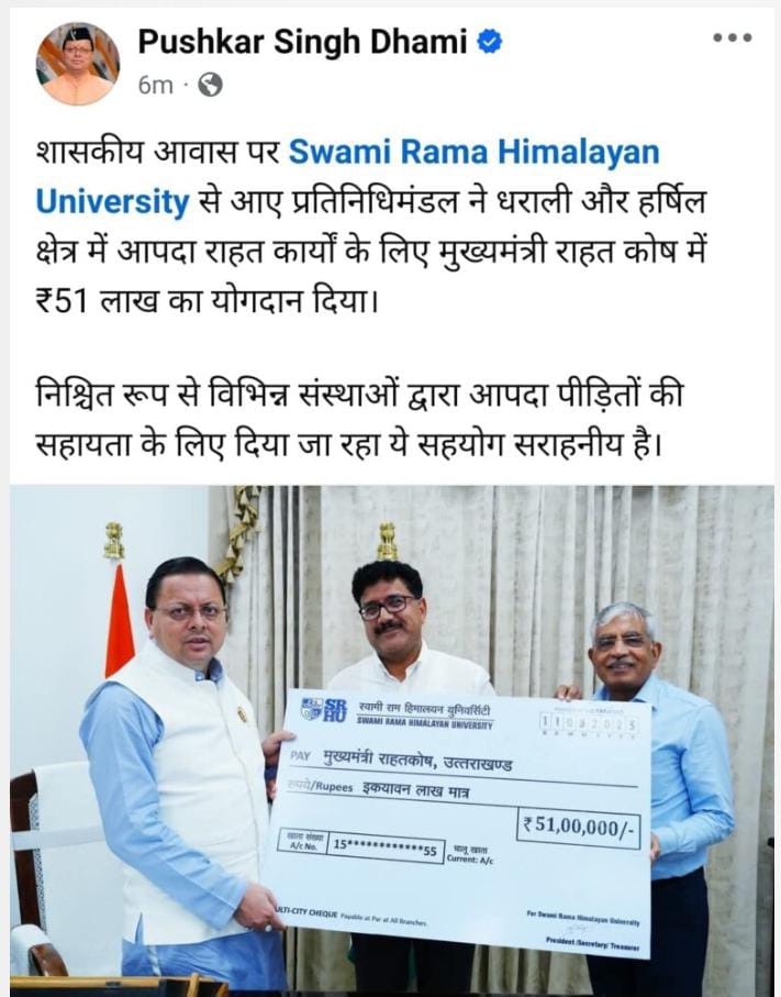 देहरादून। उत्तरकाशी के धराली और हर्षिल क्षेत्र में आई भीषण आपदा ने कई परिवारों को उजाड़ दिया, लेकिन इस कठिन घड़ी में समाज के संवेदनशील हाथ मदद के लिए आगे बढ़ रहे हैं। इन्हीं में से एक है स्वामी राम हिमालयन यूनिवर्सिटी (SRHU) जौलीग्रांट, जिसने पीड़ितों के आंसू पोंछने का बड़ा संकल्प लिया है।